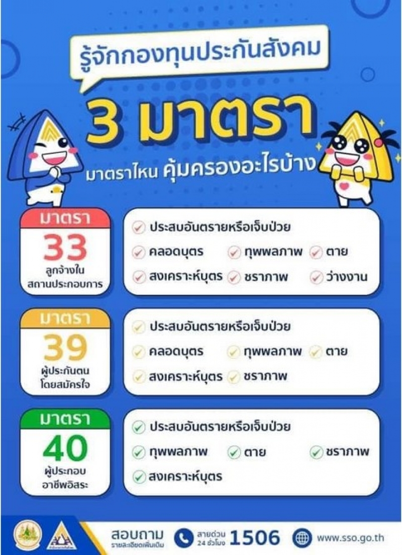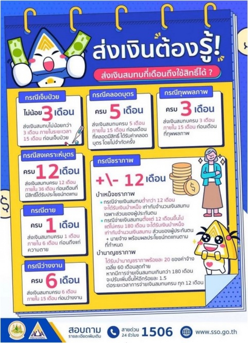 สอบถามข้อมูลเพิ่มเติมเกี่ยวกับประกันสังคมได้ที่ www.sso.go.th หรือโทรสายด่วน 1506 ให้บริการทุกวัน ตลอด 24 ชั่วโมง