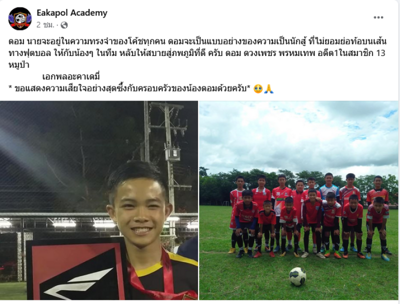 สุดอาลัย สโมสรฟุตบอลทีมหมูป่า โพสต์ถึงน้องดอม หลังทราบข่าวร้าย