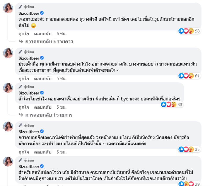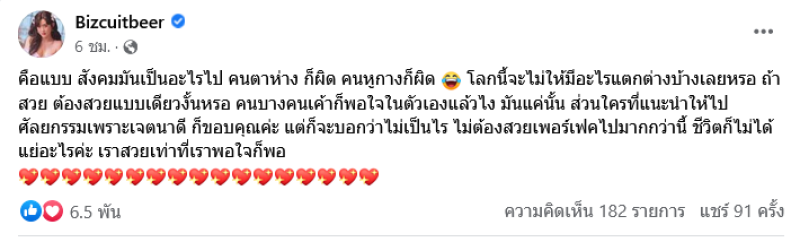 แต่เห็นสวยแซ่บแบบนี้ ก็ไม่วายโดนคนวิจารณ์ ล่าสุดสาวเบียร์ก็ได้ออกมาโพสต์ถึงทัศนคติของคนบางกลุ่มโดยระบุว่า คือแบบ สังคมมันเป็นอะไรไป คนตาห่าง ก็ผิด คนหูกางก็ผิด โลกนี้จะไม่ให้มีอะไรแตกต่างบ้างเลยหรอ ถ้าสวย ต้องสวยแบบเดียวงั้นหรอ คนบางคนเค้าก็พอใจในตัวเองแล้วไง มันแค่นั้น ส่วนใครที่แนะนำให้ไปศัลยกรรมเพราะเจตนาดี ก็ขอบคุณค่ะ แต่ก็จะบอกว่าไม่เป็นไร ไม่ต้องสวยเพอร์เฟคไปมากกว่านี้ ชีวิตก็ไม่ได้แย่อะไรค่ะ เราสวยเท่าที่เราพอใจก็พอ