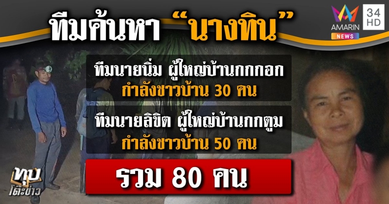อย่างไรก็ตาม ทีมค้นหานางทิน มีทีมนายนิ่ม ผู้ใหญ่บ้านกกกอก และกำลังชาวบ้าน 30 คน และมีทีมนายลิขิต ผู้ใหญ่บ้านกกตูม และกำลังชาวบ้าน 50 คน รวมคนที่ออกค้นหาทั้งหมด จำนวน 80 คน ทั้งนี้มีรายงานข่าวแจ้งเพิ่มเติมว่า ในเวลา 01.01 น. ที่ผ่านมา ทีมของลูกชายที่ออกค้นหา ได้ไปพบเจอนางทิน ผู้เป็นแม่ ที่ลานทับควาย หลังขึ้นไปเก็บเห็ดแล้วหลงเขา จ.มุกดาหาร เบื้องต้นทราบเพียงว่านางทิน มีอาการหิวข้าว และล่าสุดเจ้าหน้าที่พากลับถึงบ้านแล้วอย่างปลอดภัยในเวลาประมาณ 03.00 น.