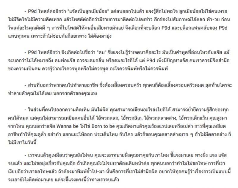 หลังจากนั้นทาง P9d โพสต์ข้อความว่า 20 กว่าปีนี้ วงการตลกมีดราม่าผมไม่เคยไปเสือก ทุกวันนี้ยังงง ๆ ว่าตลกมาเสือกอะไรกับผม ซึ่งคิดว่าคงจะเป็นใครไปไม่ได้นอกจากแจ๊ส จึงรู้สึกไม่พอใจ เพราะแค่คำว่า พวกตลก