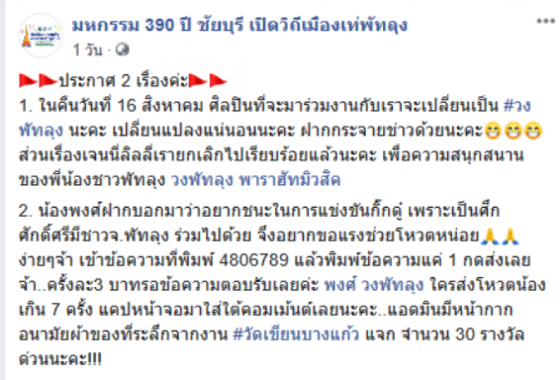ล่าสุดเฟซบุ๊กเพจ มหกรรม 390 ปี ชัยบุรี เปิดวิถีเมืองเท่ พัทลุง ได้โพสต์ข้อความแจ้งว่า ในคืนวันที่ 16 สิงหาคม 2563 ศิลปินที่จะมาร่วมงานจะเปลี่ยนเป็นวงพัทลุง พาราฮัทมิวสิค ส่วนวงของเจนนี่และลิลลี่ ได้หมดถ้าสดชื่น ทางเราได้แจ้งยกเลิกไปเรียบร้อยแล้ว เพื่อความสนุกสนานของพี่น้องชาวพัทลุง อย่างไรก็ตามกับเรื่องราวที่เกิดขึ้น และผุดแคมเปญให้เจ้าภาพคอนเสิร์ตทั่วประเทศไทย ยกเลิกการจ้างงานคอนเสิร์ตของนักร้องสาวอีกด้วย