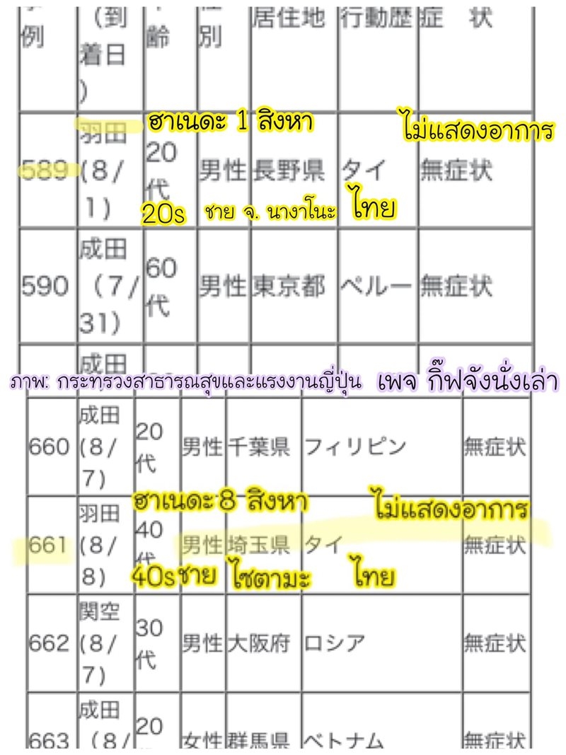 2. เป็นชายอายุประมาณ 40-49 ปี เดินทางกลับไปถึงประเทศญี่ปุ่น วันที่ 8 สิงหาคม 2563 ไม่แสดงอาการใด ๆ ลงที่สนามบินฮาเนดะ โตเกียว อาศัยอยู่ที่ จ.ไซตามะ