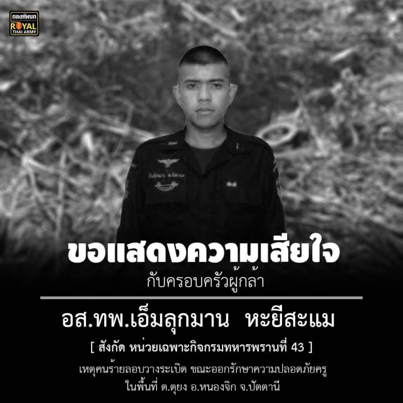 ล่าสุด เพจศูนย์ประชาสัมพันธ์กองทัพบก Army PR Center เผยโฉมหน้าผู้เสียสละเพื่อพี่น้องชาวไทยอีกคน พร้อมทั้งระบุข้อความว่า "ได้ลอบวางระเบิดที่หนองจิก จ.ปัตตานี เจ้าหน้าที่ เสียชีวิต 1 นาย ขณะเฝ้าระวังความปลอดภัยครู