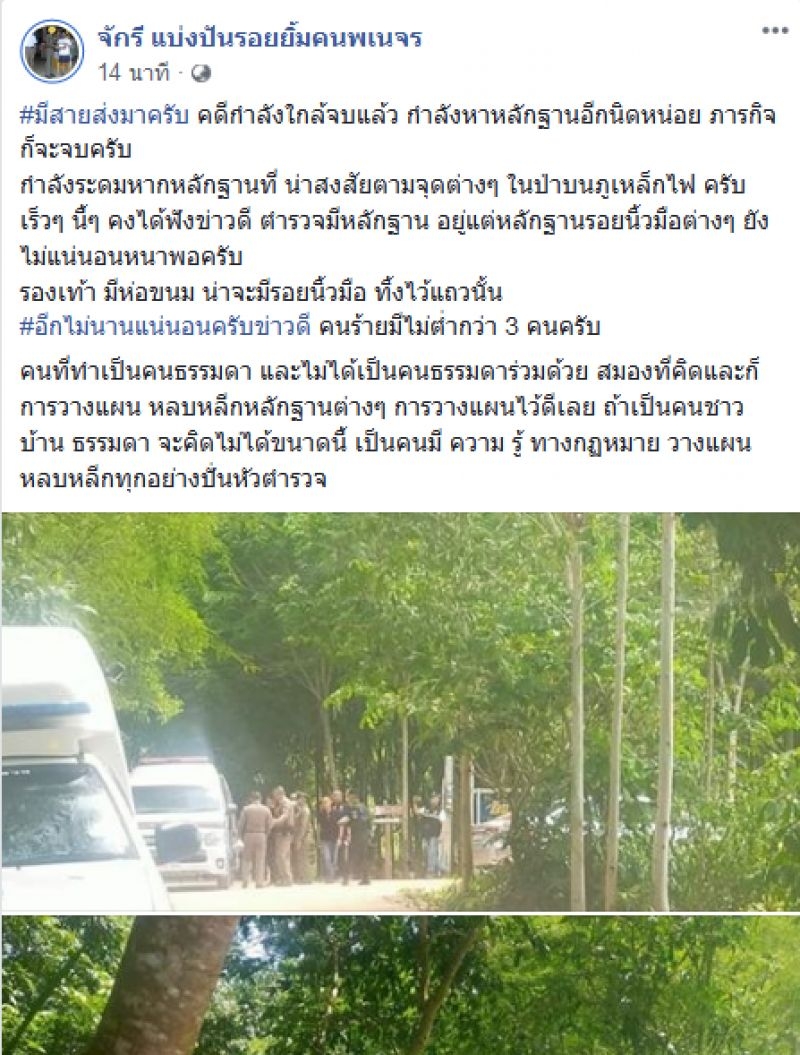 จากกรณี ผู้ใช้เฟซบุ๊กที่ใช้ชื่อว่า จักรี แบ่งปันรอยยิ้มคนพเนจร ได้โพสต์เรื่องราว ระบุว่า มีสายส่งมาครับ คดีกำลังใกล้จบแล้ว กำลังหาหลักฐานอีกนิดหน่อย ภารกิจก็จะจบครับ กำลังระดมหาหลักฐานที่ น่าสงสัยตามจุดต่างๆ ในป่าบนภูเหล็กไฟ ครับ เร็วๆ นี้ๆ คงได้ฟังข่าวดี ตำรวจมีหลักฐาน อยู่แต่หลักฐานรอยนิ้วมือต่างๆ ยังไม่แน่นอนหนาพอครับ รองเท้า มีห่อขนม น่าจะมีรอยนิ้วมือ ทิ้งไว้แถวนั้น #อีกไม่นานแน่นอนครับข่าวดี คนร้ายมีไม่ต่ำกว่า 3 คนครับ