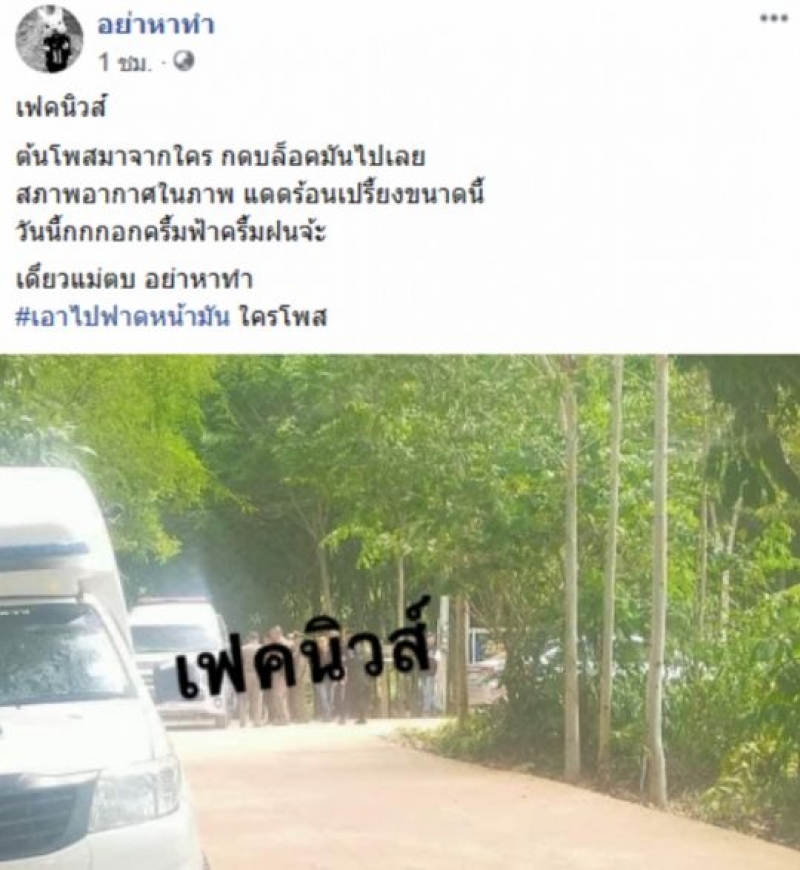 ล่าสุด เมื่อวันที่ 13 สิงหาคม เพจ อย่าหาทำ ได้โพสต์ข้อความระบุว่า เฟคนิวส์ ต้นโพสต์มาจากใคร กดบล็อคมันไปเลย สภาพอากาศในภาพ แดดร้อนเปรี้ยงขนาดนี้ วันนี้กกกอกครึ้มฟ้าครึ้มฝนจ้ะ