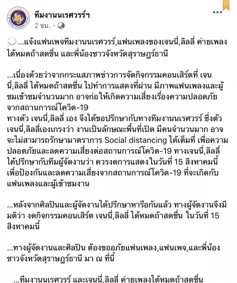 แจ้งแฟนเพจทีมงานนเรศวรร์,แฟนเพลงของเจนนี่ ลิลลี่ ค่ายเพลงได้หมดถ้าสดชื่น และพี่น้องชาวจังหวัดสุราษฎร์ธานี