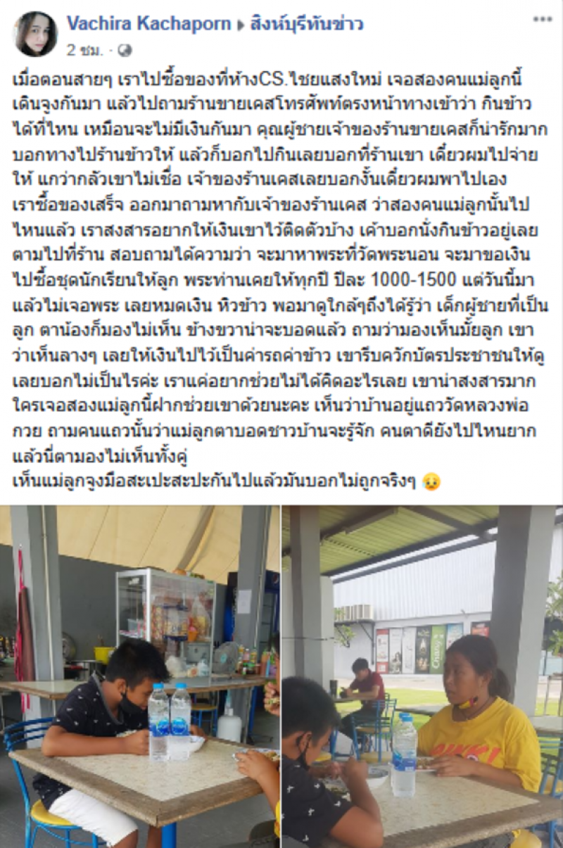เรียกได้ว่าเป็นอีกหนึ่งเรื่องราวที่ทั้งซึ้งและเศร้า เมื่อผู้ใช้เฟซบุ๊กชื่อ Vachira Kachaporn ได้มีการโพสต์เรื่องราว หลังจากที่ได้เจอกับสองแม่ลูกคู่หนึ่ง ที่กำลังหาข้าวกิน โดยผู้โพสต์เล่าว่า