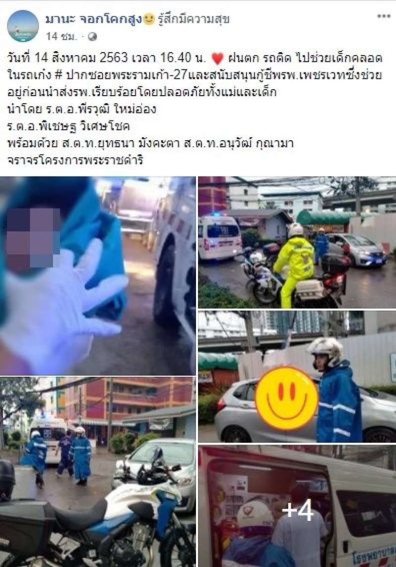วันที่ 14 สิงหาคม 2563 เวลา 16.40 น. ฝนตก รถติด ไปช่วยเด็กคลอดในรถเก๋ง ปากซอยพระรามเก้า-27และสนับสนุนกู้ชีพรพ.เพชรเวทซึ่งช่วยอยูก่อนนำส่งรพ.เรียบร้อยโดยปลอดภัยทั้งแม่และเด็ก นำโดย ร.ต.อ.พีรวุฒิ ใหม่อ่อง ร.ต.อ.พิเชษฐ วิเศษโชค พร้อมด้วย ส.ต.ท.ยุทธนา มังคะตา ส.ต.ท.อนุวัฒ์ กุณามา จราจรโครงการพระราชดำริ