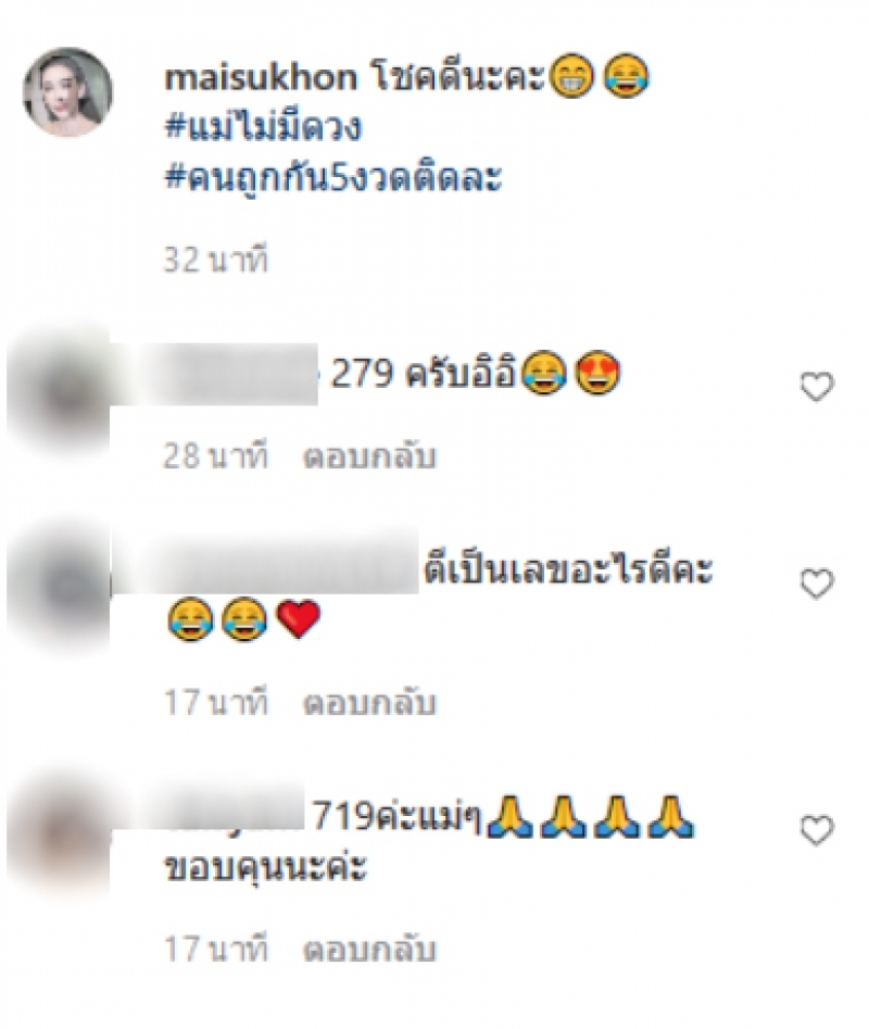 และล่าสุดสาวใหม่ก็ได้เผยความฝันอีกครั้งซึ่งเหมาะเจาะใกล้วันที่ต้องเลขออก โดยสาวใหม่เผยข้อความลงในอินสตาแกรม maisukhon ข้อความว่า แม่ๆ ฝันว่าได้ไปไหว้วัดพระแก้ว ไม่รู้แปลว่าอะไร บอกเฉยๆ 555 แม่ๆ ไม่เล่น แม่ๆ ไม่มีดวง แม่ๆ ต้องได้เงินจากการเหงื่อออกเท่านั้น พร้อมด้วยแคปชั่นว่า โช คดีกันนะคะ แม่ๆ ฝันทีไรคนเอาไป ซื้อเลข ถูกกัน 5 ครั้งติดแล้ว ซึ่งก็มีแฟนๆ พากันเขามาคอมเมนต์แสดงความคิดเห็น บางก็บอกว่าฝันแบบนี้หมายถึงอะไร