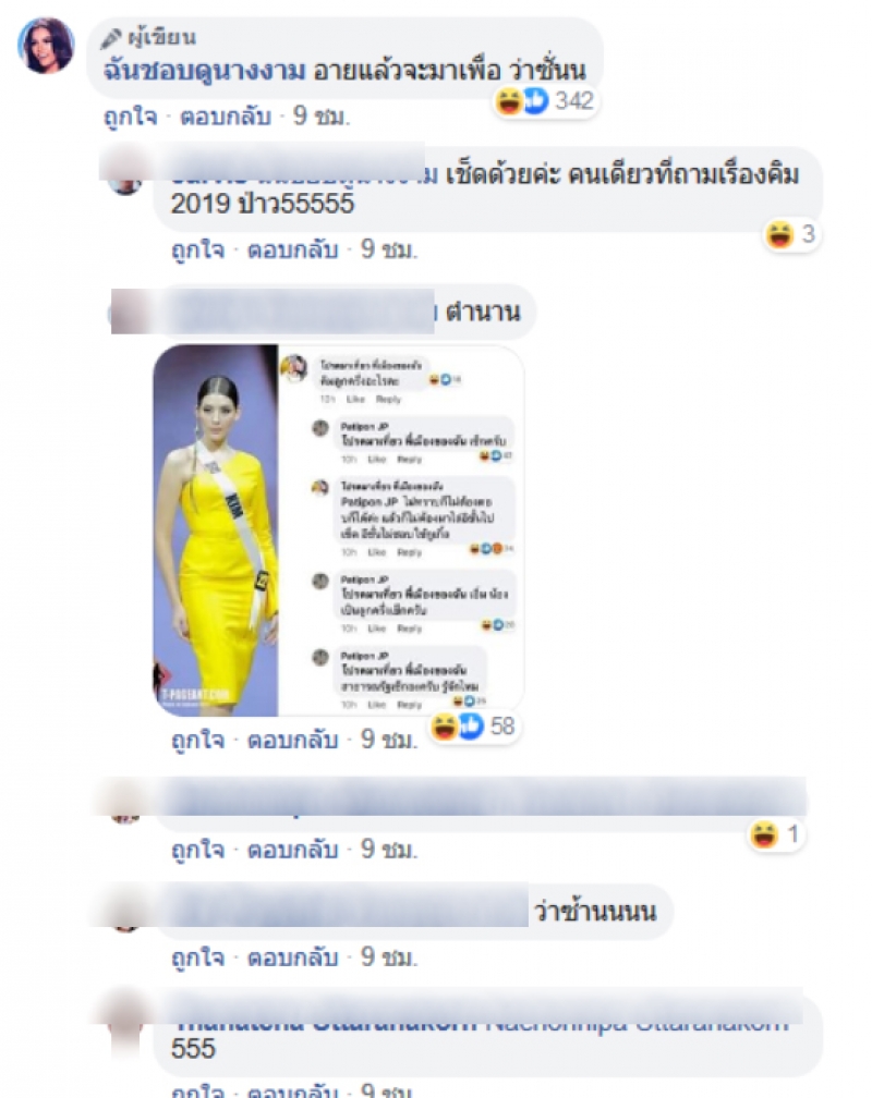 เป็นเรื่องราวที่ถูกส่งต่อกันเป็นจำนวนมากบนโลกโซเชี่ยล เมื่อมีผู้ใช้เฟสบุ๊ครายหนึ่งเข้ามาคอมเม้นต์ใต้ภาพ มิสยูนิเวิร์ส งานนี้ทำเอาฮากันทั้งโซเชี่ยล เมื่อวันที่ 18 เพจ ฉันชอบดูนางงาม ได้โพสต์ข้อความระบุว่าเรื่องฮาเยอะมาก งานนี้เป็นใครก็ต้องขำ