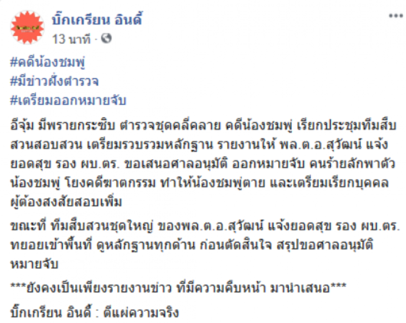 เรียกได้ว่าคดีน้องชมพู่ ได้รับความสนใจจากสังคมเป็นอย่างมาก และล่าสุดเพจดัง อย่าง บิ๊กเกรียน อินดี้ ได้โพสต์ข้อความระบุว่า คดีน้องชมพู่ มีข่าวฝั่งตำรวจ เตรียมออกหมายจับ อีจุ้ม มีพรายกระซิบ ตำรวจชุดคลี่คลาย คดีน้องชมพู่ เรียกประชุมทีมสืบสวนสอบสวน เตรียมรวบรวมหลักฐาน รายงานให้ พล.ต.อ.สุวัฒน์ แจ้งยอดสุข รอง ผบ.ตร. ขอเสนอศาลอนุมัติ ออกหมายจับ คนร้ายลักพาตัวน้องชมพู่ โยงคดีฆาตกรรม ทำให้น้องชมพู่ตาย และเตรียมเรียกบุคคล ผู้ต้องสงสัยสอบเพิ่ม ขณะที่ ทีมสืบสวนชุดใหญ่ ของพล.ต.อ.สุวัฒน์ แจ้งยอดสุข รอง ผบ.ตร. ทยอยเข้าพื้นที่ ดูหลักฐานทุกด้าน ก่อนตัดสินใจ สรุปขอศาลอนุมัติหมายจับ ยังคงเป็นเพียงรายงานข่าว ที่มีความคืบหน้า มานำเสนอ บิ๊กเกรียน อินดี้ ตีแผ่ความจริง
