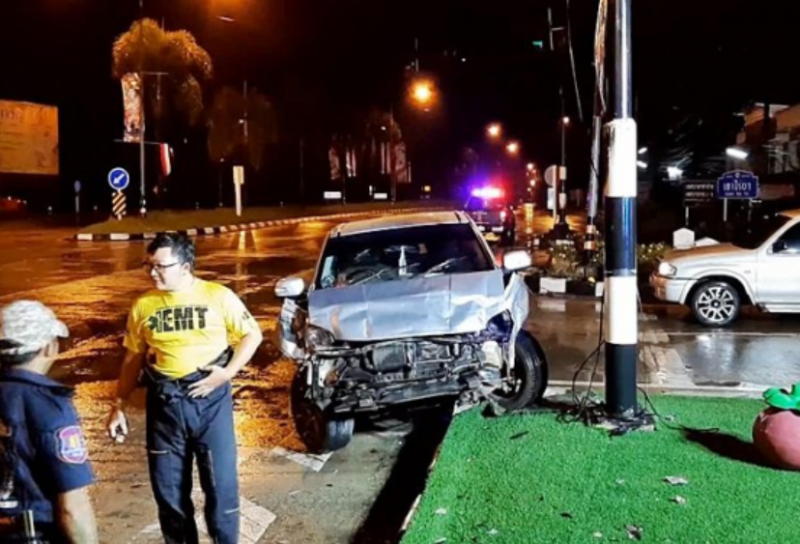 ห่างกัน 50 เมตร บริเวณกลางแยกไฟแดง พบรถกระบะคู่กรณี ยี่ห้ออีซูซุ สีบรอนซ์ ทะเบียน บห3473 จันทบุรี สภาพเสียหลักเหินขึ้นไปติดอยู่บนเกาะกลางถนน ด้านหน้ามีร่องรอยเฉี่ยวชน พังเสียหายยับเยิน โดยมีคนขับชื่อ นายเพชร (ขอสงวนนามสกุล) อายุ 53 ปี สภาพสวมกางเกงขาสั้น ไม่สวมเสื้อ บาดเจ็บเล็กน้อยและยังอยู่ในอาการมึนเมา เจ้าหน้าที่จึงนำตัวไปนั่งสงบสติอารมณ์ข้างป้อมยาม