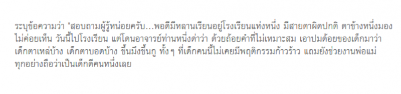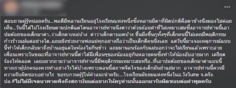 ระบุข้อความว่า สอบถามผู้รู้หน่อยครับ พอดีมีหลานเรียนอยู่โรงเรียนแห่งหนึ่ง มีสายตาผิดปกติ ตาข้างหนึ่งมองไม่ค่อยเห็น วันนี้ไปโรงเรียน แต่โดนอาจารย์ท่านหนึ่งต่อว่า ด้วยถ้อยคำที่ไม่เหมาะสม เอาปมด้อยของน้องมาว่า