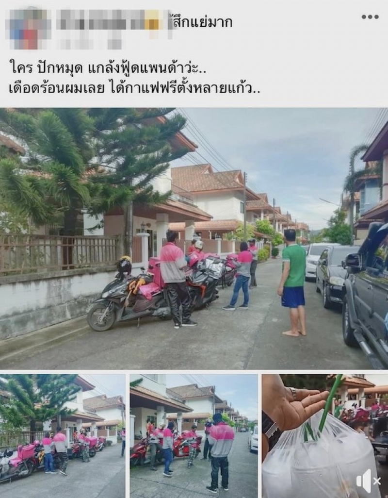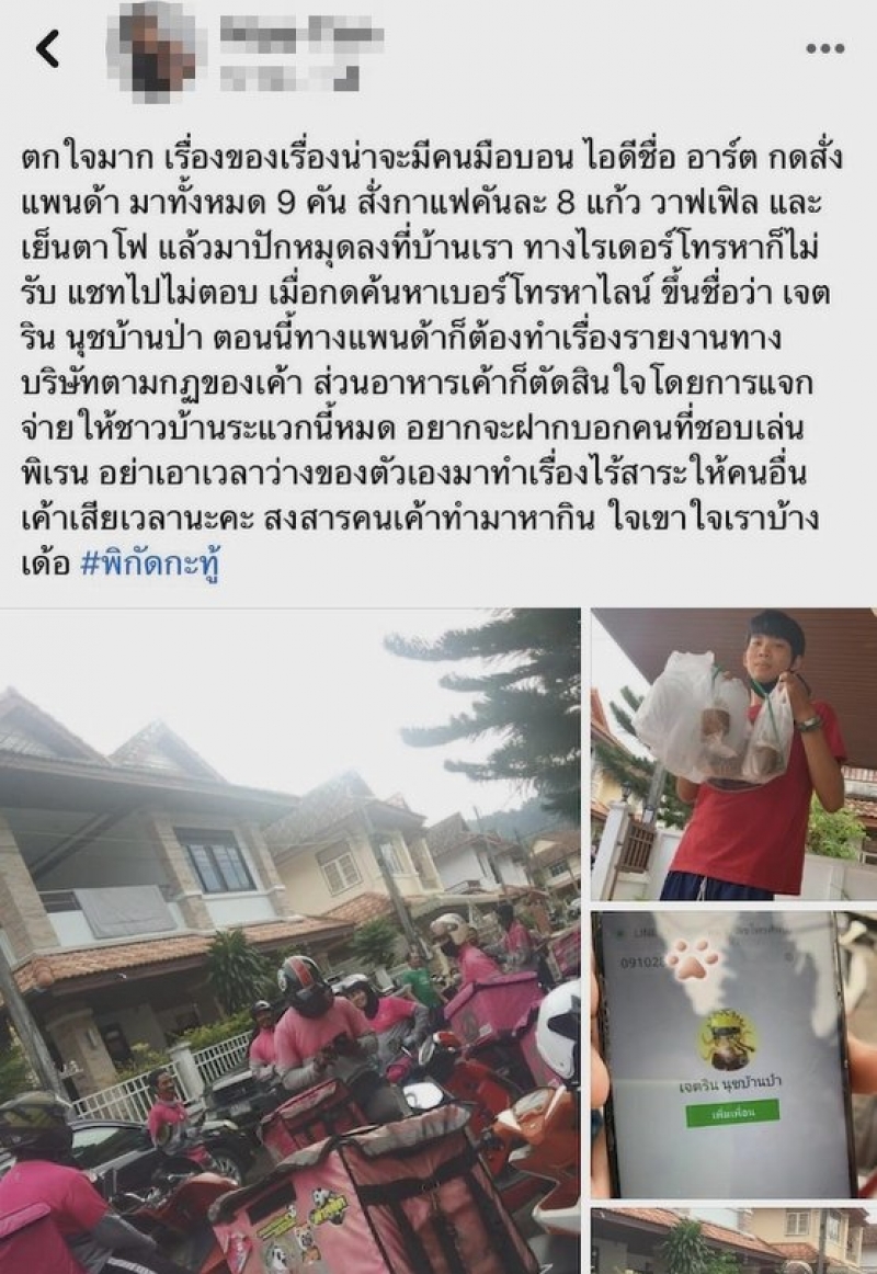 เจอแบบนี้ถึงกับมึนไปเลยทีเดียว เมื่อสาวภูเก็ตเดินออกมาหน้าบ้านถึงกับตกใจ เมื่อเห็นพนักงานส่งอาหารมาจอดรอหน้าบ้านถึง 9 คัน บอกว่าจะมาส่งกาแฟ วาฟเฟิล และ เย็นตาโฟ เพราะคนสั่งปักหมุดมาที่บ้านของเธอ ซึ่งเธอก็ปฏิเสธว่าไม่ได้สั่ง เธอจึงถามว่าสั่งอะไรไปบ้าง พนักงานส่งอาหารจึงบอกว่า สั่งกาแฟ แก้ว วาฟเฟิล และ เย็นตาโฟ อย่างละ 1 ชุด กาแฟ 3แก้ว x รถส่งอาหาร 9 คัน = 72 แก้ว เธอจึงนำเรื่องนี้มาโพสต์ พร้อมกับบอกว่าน่าจะมีคนมือบอน