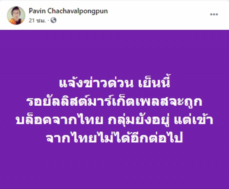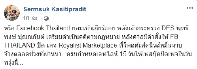 ทั้งนี้ ทางด้านผู้ใช้เฟซบุ๊ค Sermsuk Kasitipradit ได้ออมาโพสต์ขอ้ความระบุว่า หรือ Facebook Thailand ยอมเข้าเกียร์ถอย เจ้ากระทรวง DES พุทธิพงษ์ ปุณณกันต์ เตรียมดำเนินคดีตามกฎหมาย หลังศาลมีคำสั่งให้ FB THAILAND ปิด เพจ Royalist Marketplace ที่โพสต์เฟคนิวส์หมิ่นจาบจ้วงตลอดช่วงที่ผ่านมา ครบกำหนดเดทไลน์ 15 วันให้เฟสบุ๊คปิดเพจในวันพรุ่งนี้.