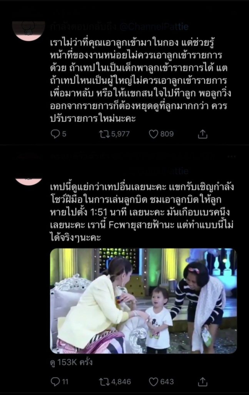 ถ้าชมจะพาลูกเข้ารายการ นั้นช่วยทำรายการเป็นของตัวเองในYoutube จะดีกว่านะคะ เรานี้ชอบรายการ 3 แซ่บที่ฉายตอนการคืนดีมากเลย ทำให้เราอยากดูตลอดเลย ถ้าปรับได้ก็จะดีนะคะ คนดูก็อยากดูมากขึ้นนะคะ ถ้าอยู่แบบนี้คนดูจะหายไปเลยนะคะ นี้ติเพื่อให้แก้นะคะ
