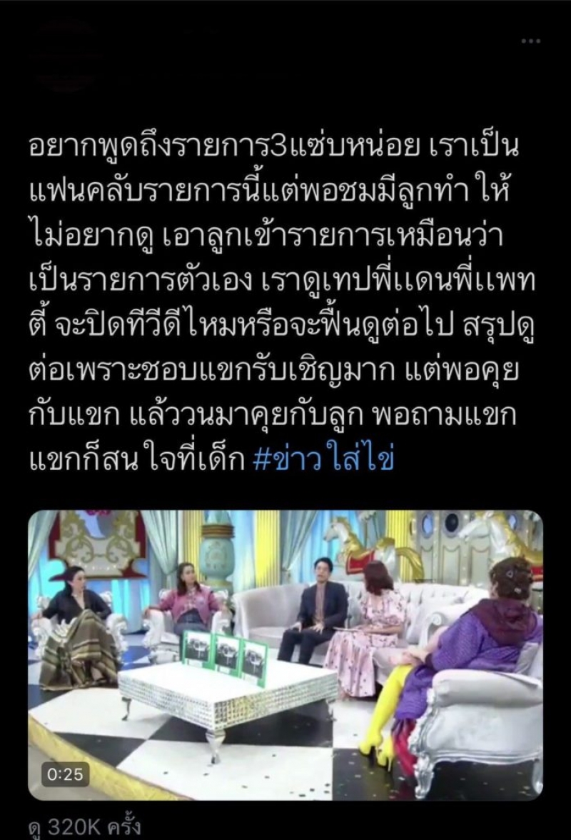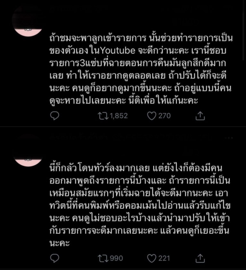ที่เราออกมาทวิตเพื่อให้คุณรับรู้แล้วแก้ไขมันนะคะ ไม่ได้มาเพื่อว่านะคะ มาเพื่อบอกให้ทราบว่าคนดูบ้างคนเขาไม่ได้ชอบนะคะ ที่เขาดูเพราะแขกรับเชิญนะคะ เรามาด้วยความหวังดีนะคะ ที่เตือนเพราะรักรายการนี้มาตั้งแต่สมัยฉายตอนกลางคืนนะคะ นี้ก็กลัวโดนทัวร์ลงมากเลย แต่ยังไงก็ต้องมีคนออกมาพูดถึงรายการนี้บ้างและ ถ้ารายการนี้เป็นเหมือนสมัยแรกๆที่เริ่มฉายได้จะดีมากนะคะ เอาทวิตนี้ที่คนพิมพ์หรือคอมเม้นไปอ่านแล้วรีบแก้ไขนะคะ คนดูไม่ชอบอะไรบ้างแล้วนำมาปรับให้เข้ากับรายการจะดีมากเลยนะคะ แล้วคนดูก็เยอะขึ้นนะคะ