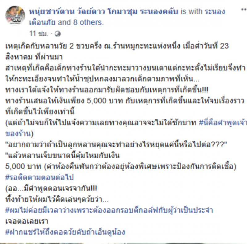 เมื่อวันที่ 26 สิงหาคม ผู้ใช้เฟสบุ๊ค หนุ่ยซาร์ตาน วัลย์ดาว โกมาซุม ระนองคลับ ได้โพสต์ข้อความระบุว่า เหตุเกิดกับหลานวัย 2 ขวบครึ่ง ณ.ร้านหมูกะทะแห่งหนึ่ง เมื่อค่ำวันที่ 23 สิงหาคม ที่ผ่านมา สาเหตุที่เกิดคือเด็กทางร้านใด้นำกะทะมาวางบนเตาแต่กะทะตั้งไม่เรียบจึงทำให้กะทะเอียงจนทำให้น้ำซุปหกลงมาลวกเด็กตามภาพที่เห็น... ทางเราใด้แจ้งให้ทางร้านออกมารับผิดชอบกับเหตุการที่เกิดขึ้น ทางร้านเสนอให้เงินเพียง 5,000 บาท กับเหตุการที่เกิดขึ้นและให้จบเรื่องราวที่เกิดขึ้นไว้เพียงเท่านี้ แต่ถ้าไม่จบก็ให้ไปแจ้งความเลยทางคุณอาจจะไม่ใด้ซักบาท นี่คือคำพูดเจ้าของร้าน