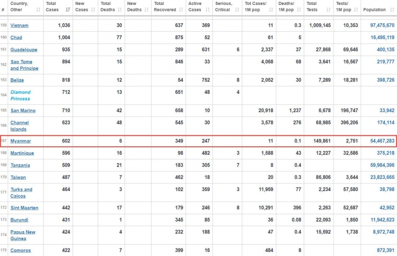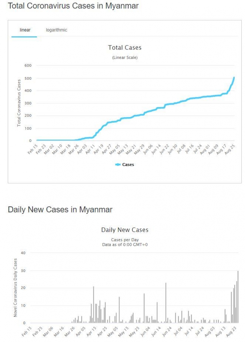 แต่ล่าสุด เมียนมา ได้เริ่มมีการระบาดอย่างหนักอีกครั้งโดยเฉพาะรัฐยะไข่ ผู้ป่วยใหม่เพิ่ม 76 ราย มากที่สุดตั้งแต่มีการแพร่ระบาดภายในประเทศ มาอยู่ที่ 602 ราย และเสียชีวิตคงที่ 6 ราย ข้อมูล ณ วันที่ 28 สิงหาคม 2563 เวลา 09.52 น. ตามเวลาประเทศไทย