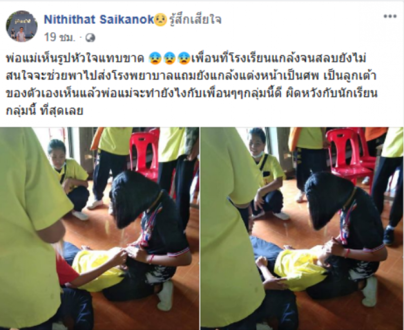 เมื่อวันที่ 27 สิงหาคม ผู้ใช้เฟสบุ๊คชื่อว่า Nithithat Saikanok ได้โพสต์ข้อความระบุว่า พ่อแม่เห็นรูปหัวใจแทบขาด เพื่อนที่โรงเรียนแกล้งจนสลบยังไม่สนใจจะช่วยพาไปส่งโรงพยาบาลแถมยังแกล้งแต่งหน้าเป็นศพ เป็นลูกเต้าของตัวเองเห็นแล้วพ่อแม่จะทำยังไงกับเพื่อนๆๆกลุ่มนี้ดี ผิดหวังกับนักเรียนกลุ่มนี้ ที่สุดเลย