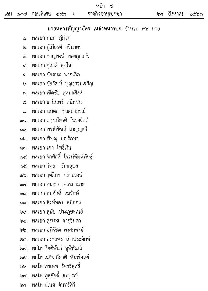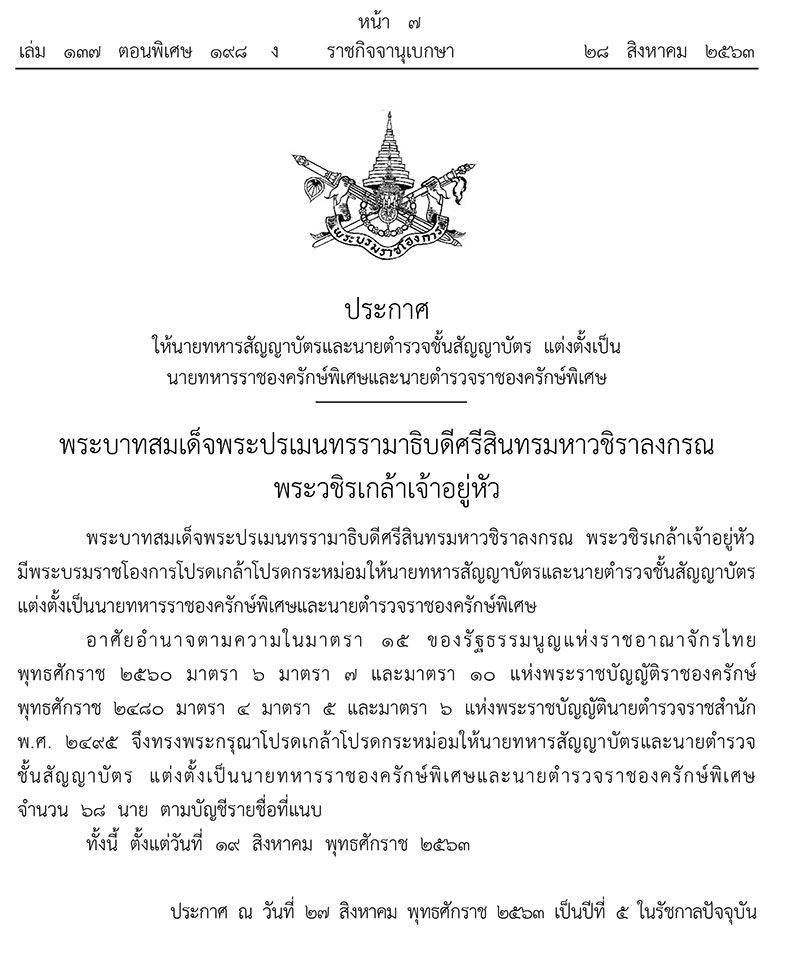 วันที่ 29 สิงหาคม 2563 เว็บไซต์ราชกิจจานุเบกษา เผยแพร่ ประกาศให้นายทหารสัญญาบัตรและนายตำรวจชั้นสัญญาบัตร แต่งตั้งเป็นนายทหารราชองครักษ์พิเศษและนายตำรวจราชองครักษ์พิเศษ โดยมีเนื้อหาระบุดังนี้