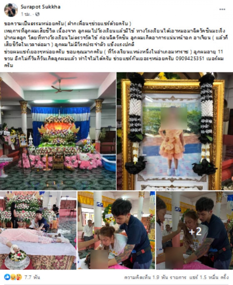 ขอความเป็นธรรมหน่อยครับ( ฝากเพื่อนๆช่วยแชร์ด้วยครับ ) เหตุการที่ลูกผมเสียชีวิต เนื้องจาก ลูกผมไปโรงเรียนแล้วมีไข้ ทางโรงเรียนได้เอาหมอมาฉีดวัคซีนมะเร็งปากมดลูก โดยที่ทางโรงเรียนไม่ตรวจวัดไข้ ก่อนฉีดวัคซีน ลูกผมเกิดอาการแน่นหน้าอก อาเจียน ( แล้วก็เสียชีวิตในเวลาต่อมา ) ลูกผมไม่มีโรคประจำตัว แข็งแรงปกติ ช่วยผมแชร์เยอะๆหน่อยครับ ขอบคุณมากครับ ( ที่โรงเรียนแหน่งหนึ่งในอำเภอมหาราช ) ลูกผมอายุ 11 ขวบ อีกไม่กี่วันก็วันเกิดลูกผมแล้ว ทำใจไม่ได้ครับ