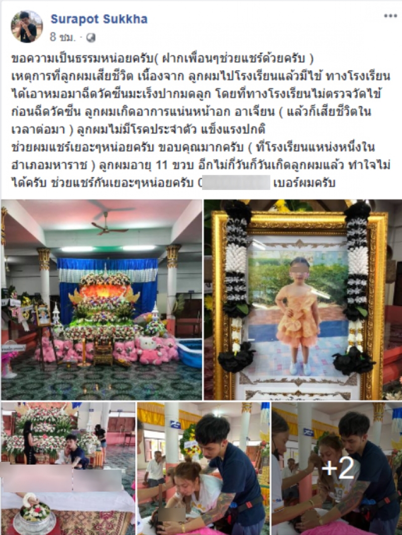 เป็นเรื่องราวที่ยากจะรับได้สำหรับพ่อแม่ ที่มีลูกวัยกำลังน่ารักแต่สุดท้ายต้องจากไปอย่างไม่มีวันกลับ เมื่อวันที่ 30 ส.ค. เฟซบุ๊กSurapot Sukkha ซึ่งคือคุณพ่อ ได้โพสต์รูปลูกสาวซึ่งเกิดเหตุสลดเสียชีวิตจากการฉีดวัคซีนป้องกันมะเร็งปากมดลูก พร้อมอยากวอนขอความเป็นธรรมให้ลูกสาว โดยระบุรายละเอียดว่า เหตุการที่ลูกผมเสียชีวิต