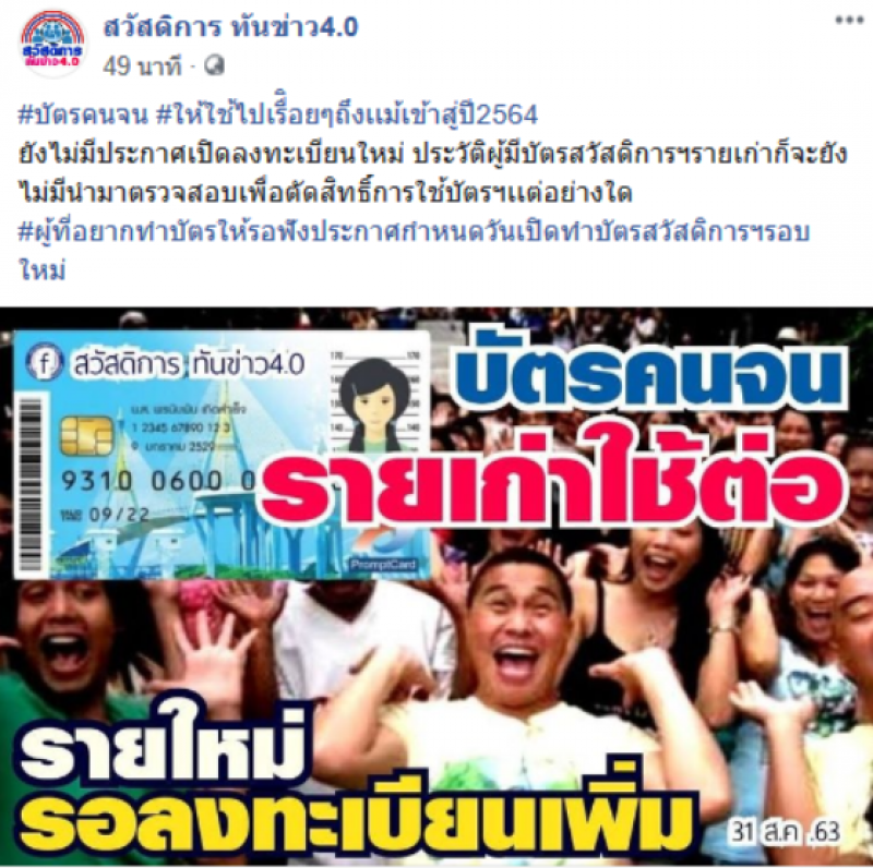 นับว่าเป็นข่าวดีเลยทีเดียว สำหรับผู้ถือบัตรสวัสดิการแห่งรัฐ ล่าสุดเมื่อวันที่ 31 สิงหาคม เพจ สวัสดิการ ทันข่าว4.0 ได้โพสต์ข้อความระบุว่า บัตรคนจน ให้ใช้ไปเรื่ิอยๆถึงเเม้เข้าสู่ปี 2564 ยังไม่มีประกาศเปิดลงทะเบียนใหม่ ประวัติผู้มีบัตรสวัสดิการฯรายเก่าก็จะยังไม่มีนำมาตรวจสอบเพื่อตัดสิทธิ์การใช้บัตรฯเเต่อย่างใด ผู้ที่อยากทำบัตรให้รอฟังประกาศกำหนดวันเปิดทำบัตรสวัสดิการฯรอบใหม่