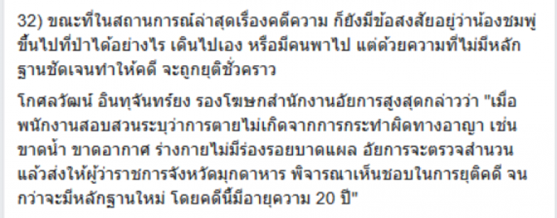 21) ปรากฎว่าสาเหตุที่น้องชมพู่เสียชีวิตคือขาดอาหารและน้ำ จนเสียชีวิต ไม่มีการทำร้ายใดๆเกิดขึ้น ดังนั้นจึงตัดประเด็นเรื่องการฆาตกรรมออกไปได้ เท่ากับว่าการเสียชีวิตของน้องชมพู่ จึงมีความเป็นไปได้เหลือเพียงสองทาง คือ 1) มีคนจับน้องชมพู่ เอามาปล่อยไว้กลางป่า สุดท้ายน้องออกไปไมได้ ก่อนจะเสียชีวิตด้วยการขาดอาหารและน้ำ และ ทางที่ 2) คือน้องวิ่งเล่นเข้ามาในป่าเอง ก่อนจะพลัดหลง แล้วสุดท้ายเสียชีวิตเอง โดยไม่มีใครทำร้าย