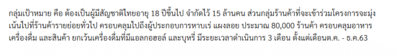 กลุ่มเป้าหมาย คือ ต้องเป็นผู้มีสัญชาติไทยอายุ 18 ปีขึ้นไป จำกัดไว้ 15 ล้านคน ส่วนกลุ่มร้านค้าที่จะเข้าร่วมโครงการจะมุ่งเน้นไปที่ร้านค้ารายย่อยทั่วไป ครอบคลุมไปถึงผู้ประกอบการหาบเร่ แผงลอย ประมาณ 80000 ร้านค้า ครอบคลุมอาหาร เครื่องดื่ม และสินค้า ยกเว้นเครื่องดื่ม