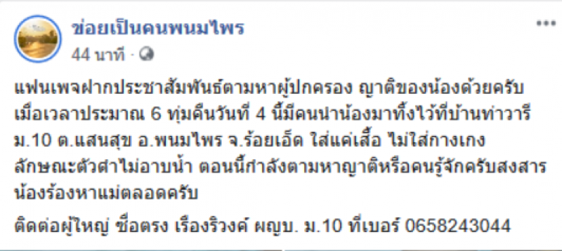 เมื่อวันที่ 4 ก.ย.63 เพจ ข่อยเป็นคนพนมไพร ได้โพสต์ข้อความระบุว่า แฟนเพจฝากประชาสัมพันธ์ตามหาผู้ปกครอง ญาติของน้องด้วยครับ เมื่อเวลาประมาณ 6 ทุ่มคืนวันที่ 4 นี้มีคนนำน้องมาทิ้งไว้ที่บ้านท่าวารี ม.10 ต.แสนสุข อ.พนมไพร จ.ร้อยเอ็ด ใส่แค่เสื้อ ไม่ใส่กางเกง ลักษณะตัวดำไม่อาบน้ำ ตอนนี้กำลังตามหาญาติหรือคนรู้จักครับสงสารน้องร้องหาแม่ตลอดครับ ติดต่อผู้ใหญ่ ซื่อตรง เรืองริวงค์ ผญบ. ม.10