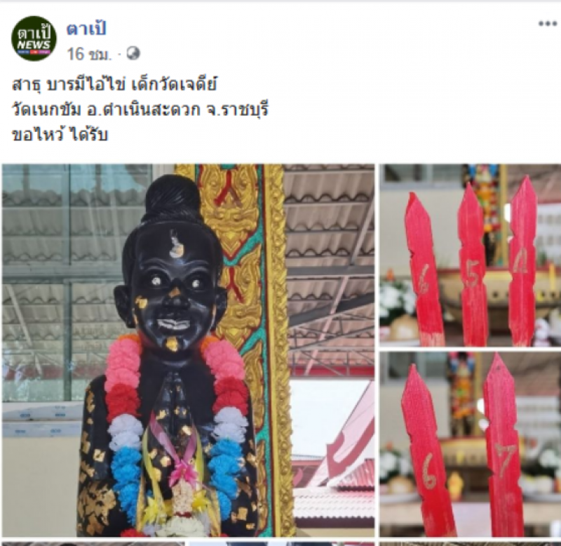 เชื่อว่าหลายๆคนฝันอยากถูกรางวัลที่ 1 กันแทบทุกคน หลายคนพอใกล้ถึงวันประกาศผลรางวัลสลากกินแบ่ง มักจะเสาะแสวงหาเลขไว้ลุ้น สำหรับใครที่ยังไม่มีเลขในใจวันนี้เราก็มีเลขมาฝากกันอีกเช่นเคย เมื่อวันที่ 5 ก.ย.63 เพจ ตาเป้ ได้โพสต์ข้อความระบุว่า สาธุ บารมีไอ้ไข่ วัดเจดีย์ วัดเนกขัม อ.ดำเนินสะดวก จ.ราชบุรี ขอไหว้ ได้รับ