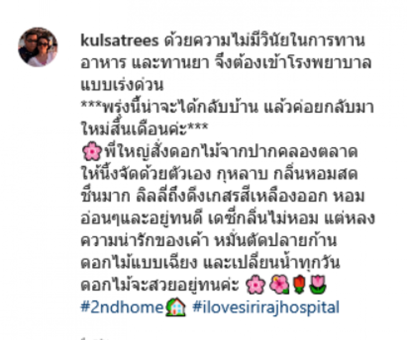 และล่าสุดผ่านมาเมื่อ2 ชั่วโมงที่แล้ว สาวนิ้ง กุลสตรี ก็ได้เข้าโรงบาลด่วน พร้อมโพสต์ภาพผ่านไอจีพร้อมแคปชั่นว่า ด้วยความไม่มีวินัยในการทานอาหาร จึงต้องเข้าโรงบาลแบบเร่งด่วน พรุ่งนี้น่าจะได้กลับบ้าน แล้วค่อยกลับมาใหม่สิ้นเดือนค่ะ