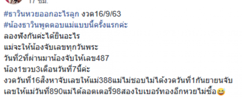 เมื่อวันที่ 5 ก.ย.63 ผู้ใช้เฟสบุ๊ครายหนึ่งได้โพสต์ข้อความระบุว่า ธาวินเลขออกอะไรลูก งวด16 ก.ย.63 น้องธาวินพูดตอบแม่แบบนี้ครั้งแรกค่ะ ลองฟังกันค่ะได้ยินอะไร แม่จะให้น้องจับเลขทุกวันพระ วันที่ 2 ที่ผ่านมาน้องจับให้เลข 487 น้อง1ขวบ3เดือนวันที่7นี้ค่ะ งวดวันที่16 สิงหา จับเลขให้แม่ 388 แม่ไม่ชอบไม่ได้ วันที่1กันย ายน จับเลขให้แม่วันที่ 890 แม่ได้ลอตเตอรี่ 98 สองใบเบอร์ทองอีกเลขไม่ซื้อ