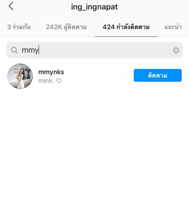 และล่าสุดชาวโซเชียลก็ได้เม้ามอยกันว่า มิ้ง ศวภัทร ได้อันฟอลโล่ไอจีสาวอิงอิง เรียบร้อยแล้วทำเอาหลายๆคนสงสัยเลยทีเดียวทั้งที่ก่อนเกิดเรื่องทั้งคู่ยังติดตามกันอยู่ หรือว่าไม่กินเส้นกันแล้ว แต่กลับพบว่าสาวอิงอิง ยังได้ติดตามสาวมิ้งอยู่
