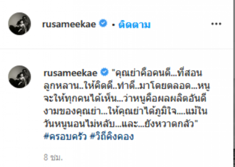 ล่าสุดทางด้านรัศมีแขได้โพสต์ภาพผ่านไอจีเหมือนกับการให้กำลังใจตัวเองพร้อมแคปชั่นว่า คุณย่าคือคนดี ที่สอนลูกหลานให้คิดดี ทำดี มาโดยตลอดหนูจะทำให้ทุกคนได้เห็นว่าหนูคือผลผลิตอันดีงามของคุณย่า ให้คุณย่าได้ภูมิใจ แม่ในวันที่หนูนอนไม่หลับ และยังหวาดกลัว #ครอบครัว #วิถีคิงคอง