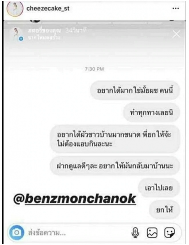 และต่อมาล่าสุดก็มีสาวปริศนาคนนึงได้ออกมาโพสต์พร้อมแท็กสาว เบนซ์ ประมาณว่าสาวเบนซ์ ได้ไปยุ่งกับแฟนของเค้า และทางสาวคนนั้นก็ได้ลบโพสต์ออกไป ต่อมาแฟนคลับได้ไปขุดมาว่าผู้หญิงคนนี้เป็นใครก็กลายเป็นสาว ชีสเค้ก สุกัญญา ธรรมมะ ที่เป็นคนออกมาโพสต์เรื่องราวทั้งหมดพร้อมระบุว่า ยกให้นะ แอบกินไม่แซ่บหรอก @benzmonchanok มาเอาไปนะ จะได้รู้ มีจริงไม่โลกสวยนะคะ ไม่ต้องแอ๊บนะ ร้ายมาเลย อยากได้สามีชาวบ้านขนาดนี้ พี่ก็ต้องยกให้น้องนั่นแหละ ตามสบายนะ นิ่งมา 3 เดือนแล้วรอดูว่าจะยังไง ไม่จบนะ กวนโพสต์นู้นนี่นั่น น้องจะเอาแบบนี้กับพี่ก็ยินดีค่ะ ทำเอาแฟนคลับหลายๆคนงงไปตามๆกันว่าเหตุเกิดจากอะไร