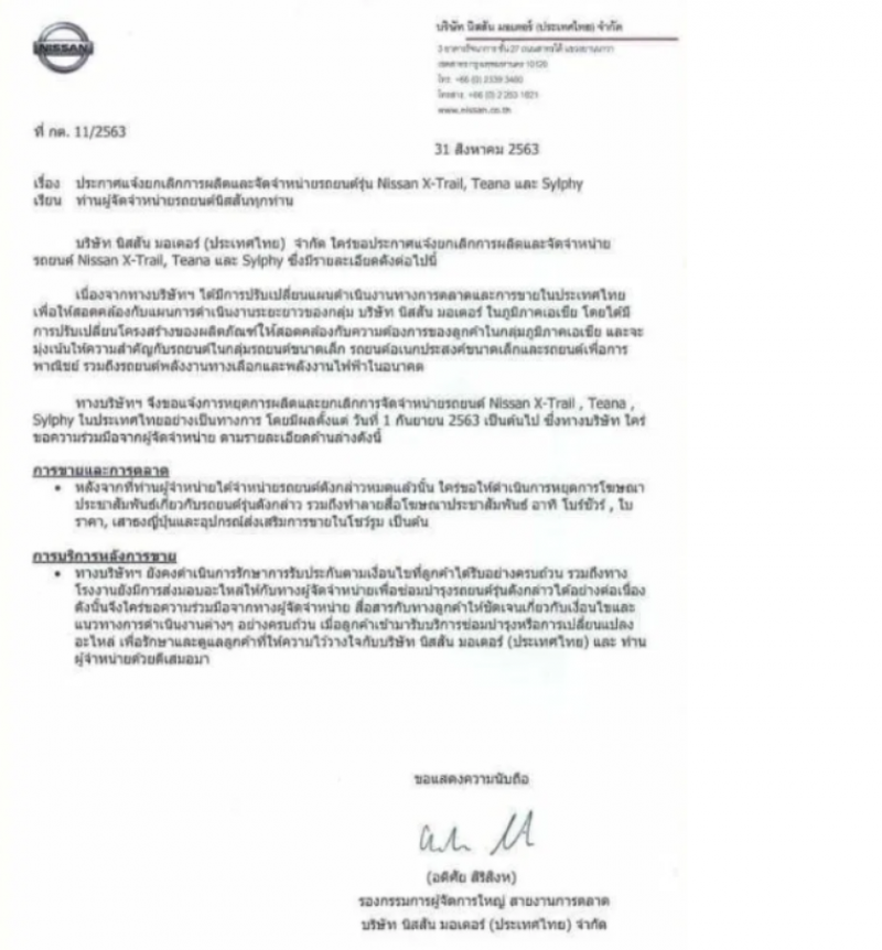 ทางบริษัทฯ จึงขอแจ้งการหยุดผลิตและยกเลิกการจัดจำหน่ายรถยนต์ Nissan X-Trail Teana Sylphy ในประเทศไทยอย่างเป็นทางการ โดยมีผลตั้งแต่ วันที่ 1 กันย ายน 2563 เป็นต้นไป ซึ่งทางบริษัท ใคร่ขอความร่วมมือจากผู้จัดจำหน่าย ตามรายละเอียดด้านล่าง ดังนี้ ทั้งนี้ในส่วน การขายและการตลาด