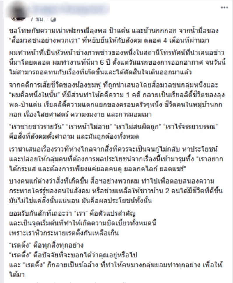 จาการกรณี เฟสบุ๊ค นักข่าวช่องดังได้โพสต์ข้อความระบุว่า ขอโทษ กรณีลุงพล ป้าแต๋น และบ้านกกกอก จากน้ำมือของ สื่อมวลชนอย่างพวกเรา ที่หยิบยื่นให้กับสังคม ตลอด 4 เดือนที่ผ่านมา ผมทำหน้าที่เป็นหัวหน้าช่างภาพข่าวของหนึ่งในสถานีโทรทัศน์ที่นำเสนอข่าวนี้มาโดยตลอด ผมทำงานที่นี่มา 6 ปี ตั้งแต่วันแรกของการออกอากาศ จนวันนี้ไม่สามารถอดทนกับเรื่องที่เกิดขึ้นและได้ตัดสินใจเดินออกมาแล้ว จากคดีการของน้องชมพู่ ที่ถูกนำเสนอโดยสื่อมวลชนกลุ่มหนึ่งและ ผมคือหนึ่งในนั้น ที่มีส่วนทำให้คดีความ 1 คดี กลายเป็นเรียลลิตี้ชีวิตของลุงพล ป๋าแต๋น เรียลลิตี้ความแต กแยกของครอบครัวๆหนึ่ง ชีวิตคนในหมู่บ้านกกกอก เรื่องไส ยศาสตร์ ความงมงาย และการมอมเม า
