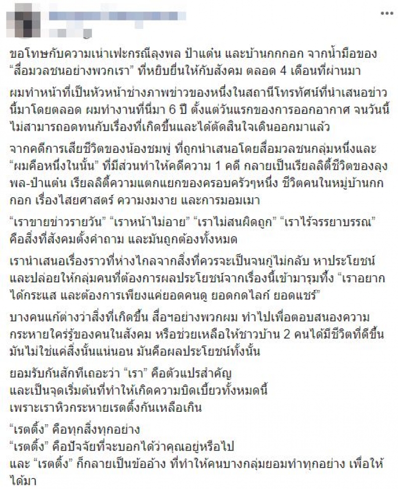 สื่อหลัก สื่อรอง สื่อใดๆ สำคัญมากจริงๆ ดูง่ายๆ พวกคุณสามารถเปลี่ยนเรื่องราวการเสียชีวิตของเด็กผู้หญิงคนนึง ให้กลายเป็นอะไรไปแล้วก็ไม่รู้ ไม่รู้สึกอะไรบ้างเหรอคะ ไม่มีใครในองค์กรเตือนกันบ้าง หรือเอะใจสักหน่อย