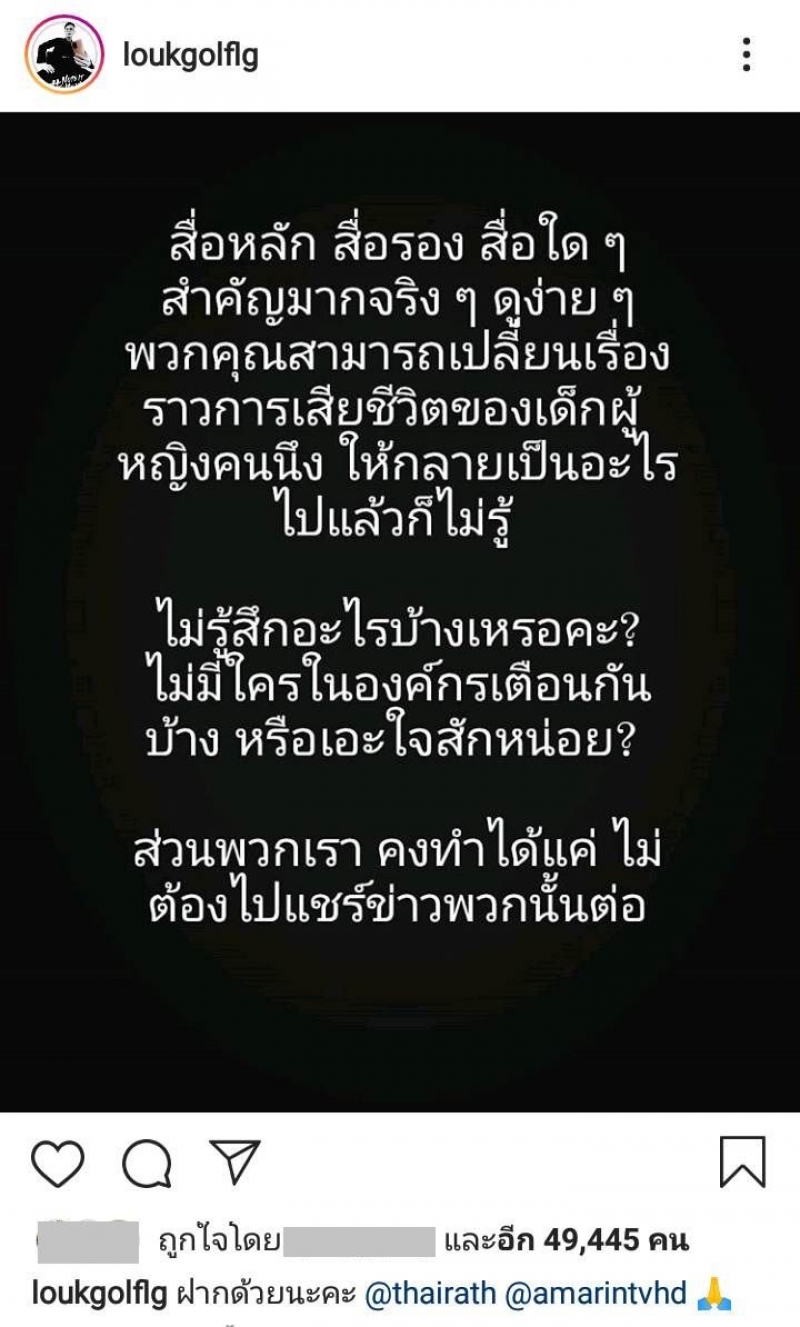 ล่าสุด พิธีกรและครูสอนภาษาอังกฤษคนดังขวัญใจคนบันเทิงและชาวโซเชียลอย่าง ลูกกอล์ฟ คณาธิป สุนทรรักษ์ หรือที่หลายๆ คนรู้จักกันดีในนาม ครูลูกกอล์ฟ ก็ได้ออกมาแสดงความคิดเห็นในเรื่องนี้เช่นเดียวกัน ซึ่งเจ้าตัวก็ได้โพสต์ภาพข้อความลงอินสตาแกรมส่วนตัว โดยระบุเนื้อหาเอาไว้ว่า ฝากด้วยนะคะ พร้อมแท็กไปยังอินสตาแกรมของช่อง ไทยรัฐ และ อมรินทร์