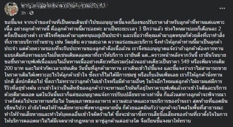 วันนั้นที่ลูกค้ามาทาน เราเดินเข้าไปชี้แจง และชี้แจงว่าเราไม่สามารถขายในราคาเดิมได้เพราะอะไรให้ลูกค้าเข้าใจ ซึ่งเราก็ไม่ได้มีการข่มขู่ หรือเก็บเงินเพิ่มเลย เราก็ให้ลูกค้านั่งทานปกติ สั่งปกติต่อไป ซึ่งเราไม่ทราบว่าลูกค้าไม่เข้าใจหรือมีคำถามอื่นๆ ในใจอีกไหมแต่ลูกค้าไม่ถามแต่มีการรีวิวที่อยู่ข้างต้น เราเข้าใจว่าเป็นสิทธิของลูกค้าว่าจะทานอะไรมันก็อยู่ในราคาบุฟเฟ่ต์แล้วเราเข้าใจดีและบริการด้วยดีมาตลอด แต่ในวันนั้นเราก็แค่ขออนุญาตแจ้งการปรับเปลี่ยนราคาเท่านั้น ก็แล้วแต่ทางลูกค้าจะพิจารณาว่าครั้งต่อไปจะมาทานหรือไม่ ในคุณภาพของอาหาร ความสะอาดและงานบริการของร้านเรา