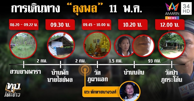 นางดอน กล่าวต่อว่า ตอนแรกตนก็จำไม่ได้ว่าเจอกับลุงพลวันที่ 10 หรือวันที่ 11 พ.ค.63 แต่เมื่อได้คุยกับลุงม็อคก็จำได้ว่าน่าจะเป็นวันที่ 11 พ.ค.63 เพราะตอนที่ลุงพลเดินทางไปส่งพระนั้น ลุงม็อคเห็นถุงข้าวสารนั่นหมายถึงวันนั้นเป็นวันที่ 11 พ.ค.63 อย่างไรก็ตาม กรณีที่ตำรวจนำตัวลุงม็อคไปชี้จุดต่าง ๆ เพราะต้องการจะรู้ว่าลุงม็อคและป้าถอนเดินทางไปกับลุงพลจริงหรือไม่ ซึ่งตนก็ไม่รู้ว่าตำรวจจะทำแบบนี้ไปเพื่ออะไร แต่ตนก็พร้อมที่จะเป็นพยานให้ลุงพล แต่สามารถยืนยันได้เพียงว่าเห็นลุงพลอยู่ที่วัดภูผาแอกเท่านั้น