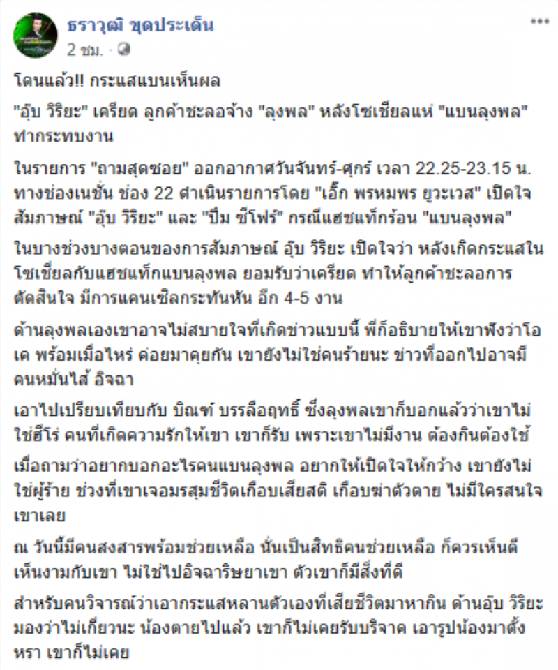 อุ๊บ วิริยะ เครียด หลังโซเชียลแห่ แบนลุงพล