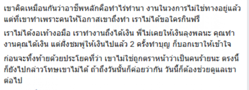 แต่ที่เขาทำเพราะคนให้โอกาสเขาถึงทำ เราไม่ได้ขอใครกินฟรี เราไม่ได้งอเ ท้างอมือ เราทำงานถึงได้เงิน พี่ไม่เคยให้เงินลุงพลนะ คุณทำงานคุณได้เงิน แต่ฝั่งชมพู่ให้เงินไปแล้ว 2 ครั้งทำบุญ ก็บอกเขาให้เข้าใจ ก่อนจะทิ้งท้ายด้วยประโยคที่ว่า เขาไม่ใช่ถูกตร าหน้าว่าเป็นคนร้ ายนะ ตรงนี้ก็ยังไปกล่าวโทษเขาไม่ได้ ถ้าถึงวันนั้นก็ค่อยว่ากัน วันนี้ก็ต้องช่วยดูแลเขาต่อไป