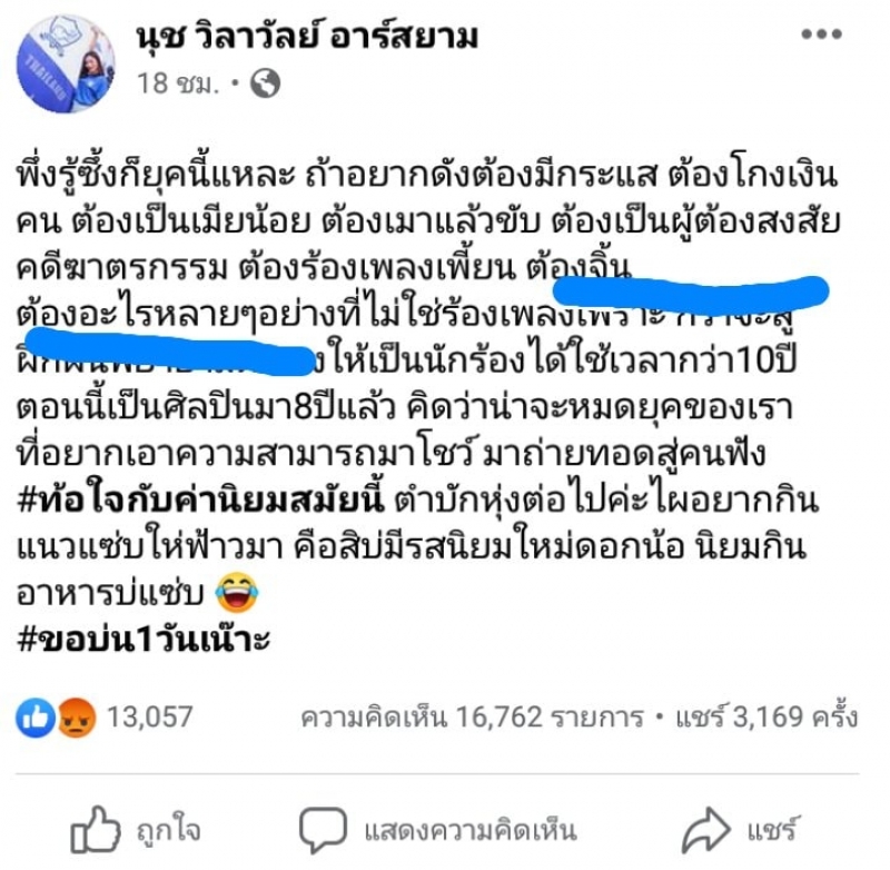 และนักร้องดังอย่าง นุช วิลาวัล อาร์สย าม ก็ได้ออกมาโพสต์ด้วยเช่นกัน