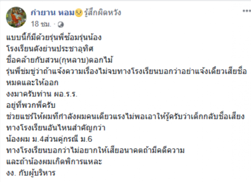 เมื่อวันที่ 10 กย 63 กำยาน หอมได้โพสต์ข้อความระบุว่า แบบนี้ก็มีด้วยรุ่นพี่ซ้อมรุ่นน้อง โรงเรียนดังย่านประชาอุทิศ ชื่อคล้ายกับสวน(กุหลาบ)ดอกไม้ รุ่นพี่ข่มขู่ว่าถ้าแจ้งความเรื่องไม่จบทางโรงเรียนบอกว่าอย่าแจ้งเดี๋ยวเสียชื่อหมดและให้ออก งงมาครับท่าน ผอ.ร.ร. อยู่ที่พวกพี่ครับ ช่วยแชร์ให้ผมทีกำลังผมคนเดียวแรงไม่พอเอาให้รู้ครับว่าเด็กกลับชื่อเสียงทางโรงเรียนอันไหนสำคัญกว่า น้องผม ม.4ส่วนคู่กรณี ม.6 ทางโรงเรียนบอกว่าไม่อยากให้เสียอนาคตถ้ามีคดีความ และถ้าน้องผมเกิดพิการแหละ งง. กับผู้บริหาร