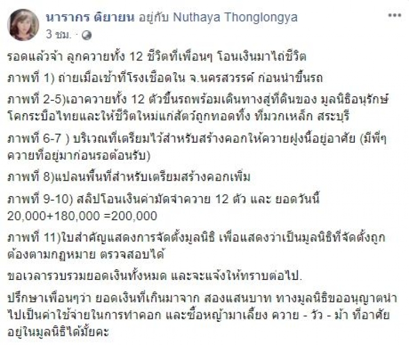 วันนี้ ( 14 กันยายน 2563 ) ที่เฟซบุ๊ก นารากร ติยายน ได้มีการโพสต์รูปภาพพร้อมทั้งระบุข้อความเอาไว้ว่า.. รอดแล้วจ้า ลูกควายทั้ง 12 ชีวิตที่เพื่อนๆ โอนเงินมาไถ่ชีวิต ภาพที่ 1) ถ่ายเมื่อเช้าที่โรงเชือดใน จ.นครสวรรค์ ก่อนนำขึ้นรถ ภาพที่ 2-5)เอาควายทั้ง 12 ตัวขึ้นรถพร้อมเดินทางสู่ที่ดินของ มูลนิธิอนุรักษ์โคกระบือไทยและให้ชีวิตใหม่แก่สัตว์ถูกทอดทิ้ง ที่มวกเหล็ก สระบุรี