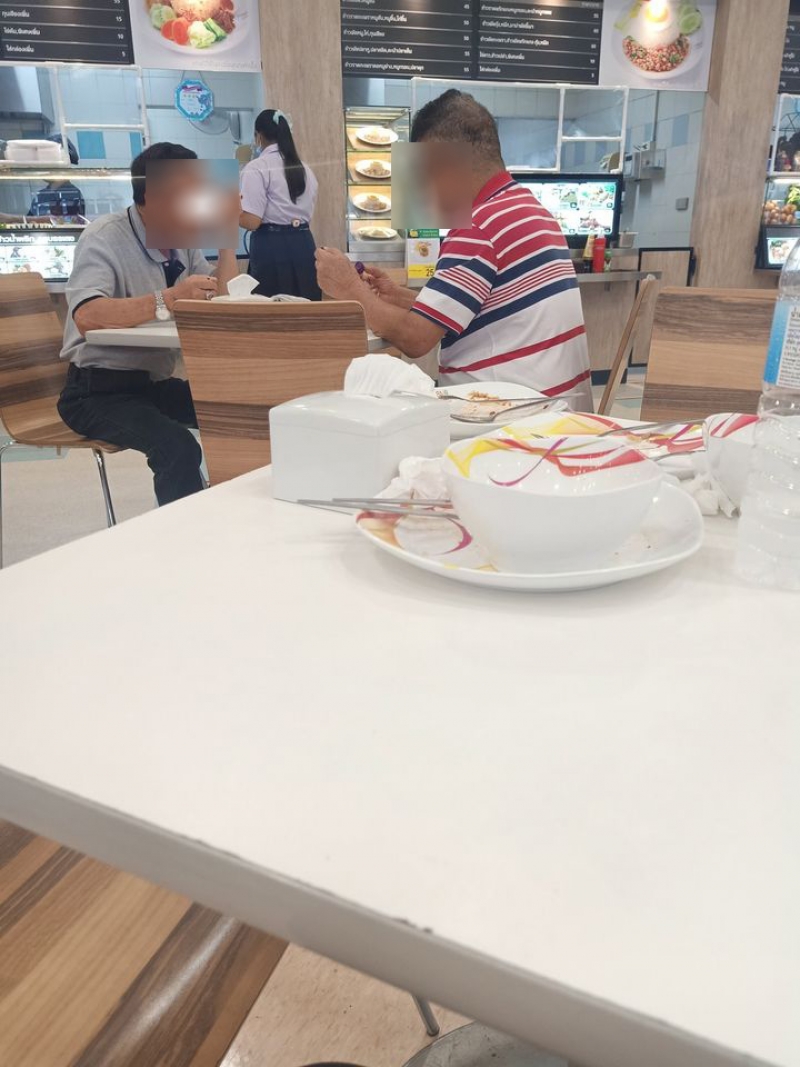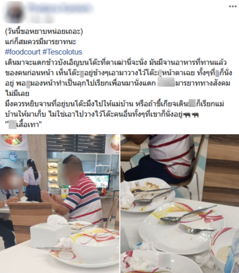 เป็นอีกหนึ่งเหตุการณ์ที่ถูกวิพากษ์วิจารณ์ในโลกออนไลน์ เมื่อสาวรายหนึ่งได้โพสต์เรื่องราวลงในเฟซบุ๊ก เล่าว่า ขณะที่นั่งรับประทานอาหารที่ห้างแห่งหนึ่ง จู่ๆก็มีชายสูงอายุ นำจานอาหารที่ทานเสร็จแล้ว มาวางที่โต๊ะของตน ทั้งๆที่ตนเองก็ยังนั่งอยู่ ก่อนที่ชายรายนี้จะเดินกลับไปนั่งที่โต๊ะของตนเองหน้าตาเฉย เมื่อตนมองกลับไปก็ทำทีเฉยเมยเหมือนไม่มีอะไรเกิดขึ้น